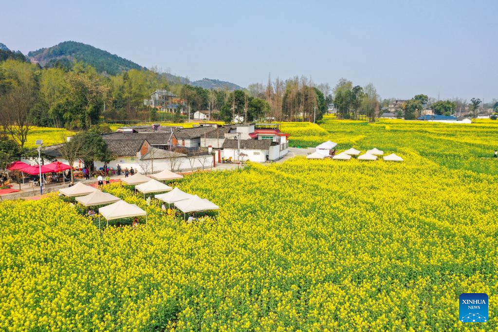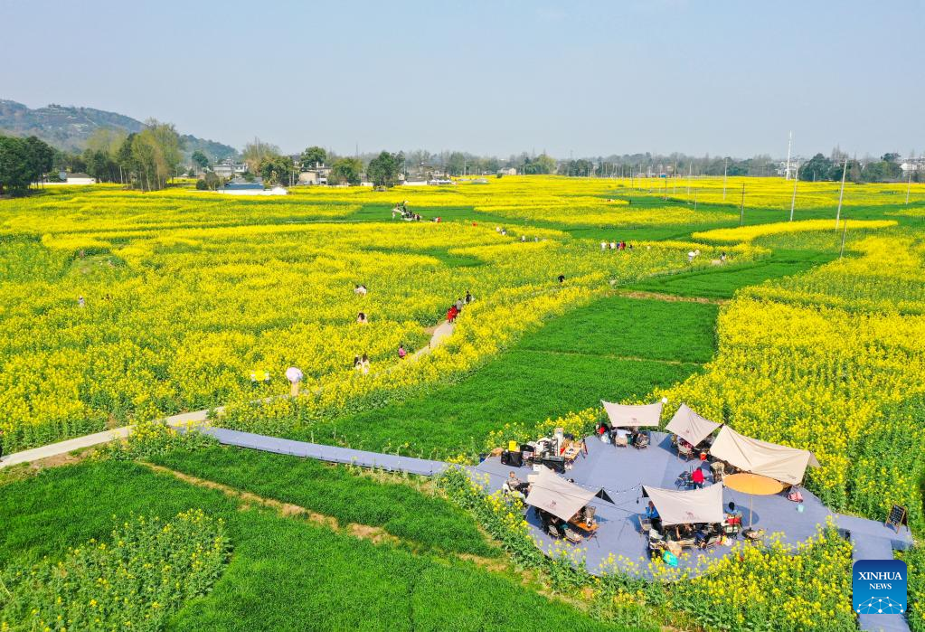 This aerial photo taken on March 5, 2023 shows tourists visiting a cole flower field in Daoming Town of Chongzhou, southwest China's Sichuan Province. (Xinhua/Wang Xi)