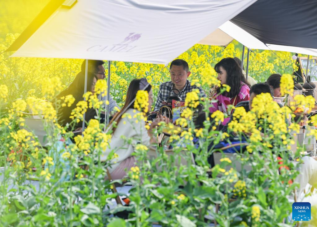 Tourists rest in a cole flower field in Daoming Town of Chongzhou, southwest China's Sichuan Province, March 5, 2023. (Xinhua/Wang Xi)
