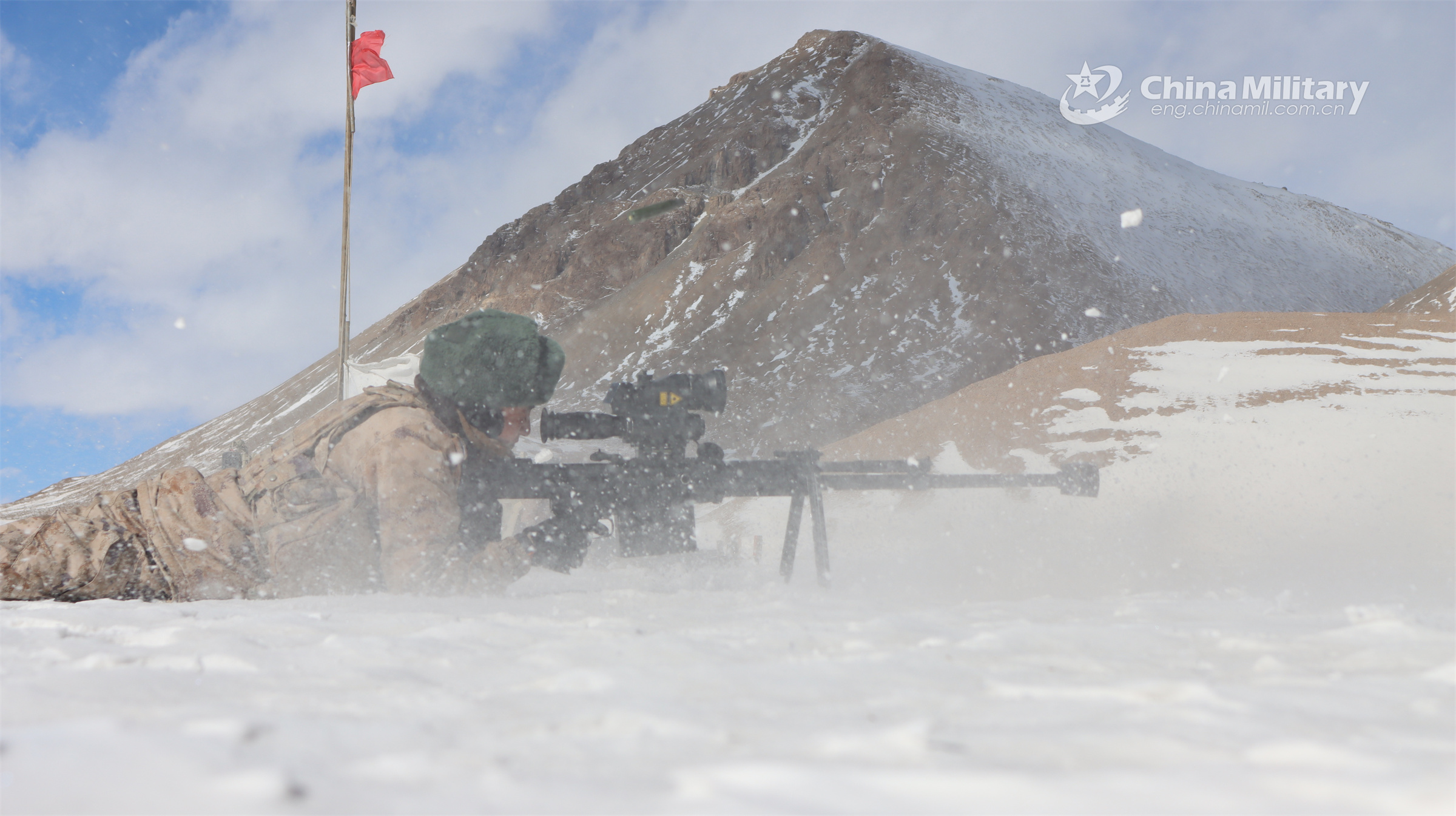 A soldier assigned to a support regiment under the PLA's Xinjiang Military Command aims the sniper rifle at target in the snow during a recent shooting training exercise. (eng.chinamil.com.cn/Photo by Song Xiaomin)