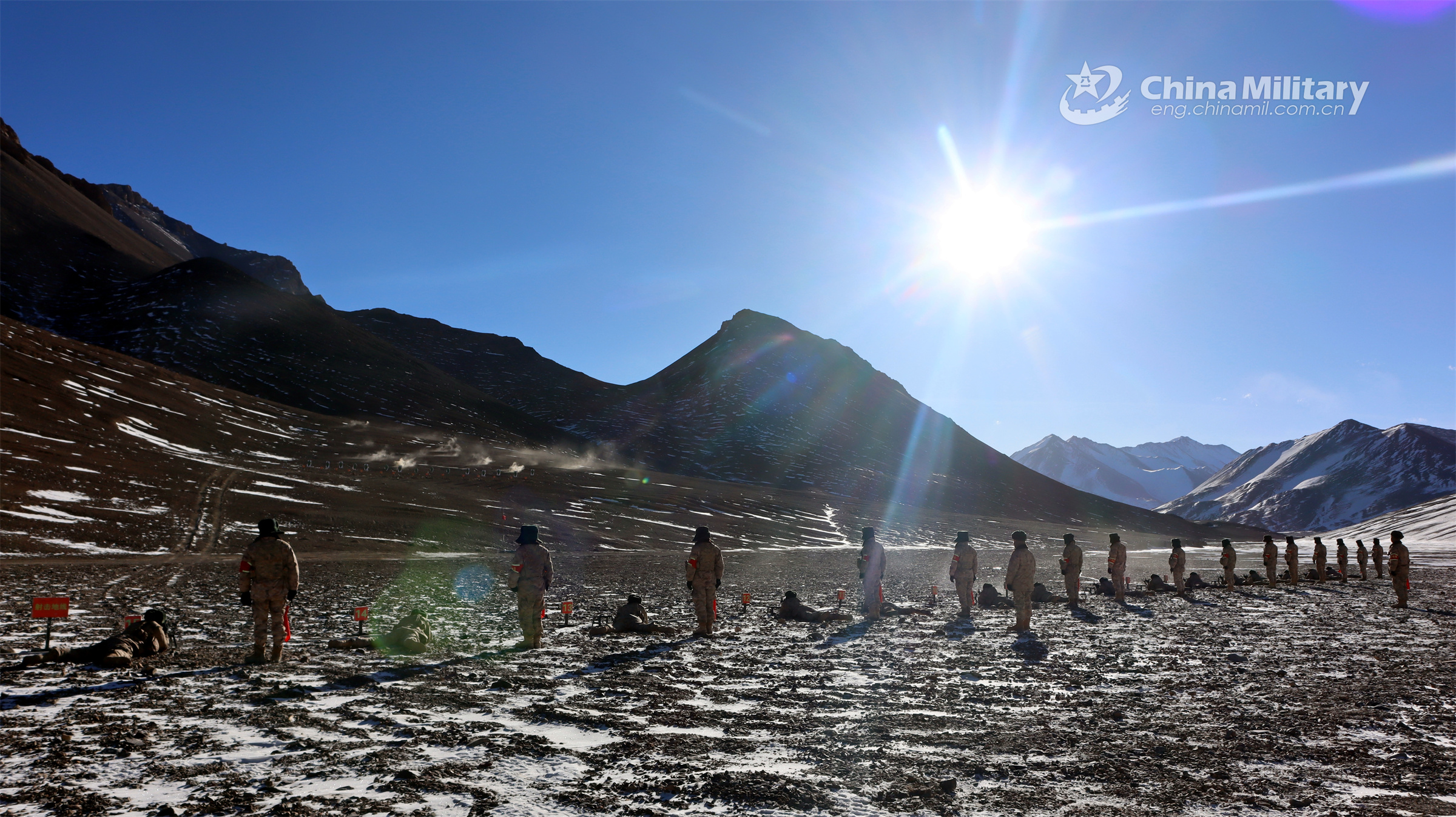 Soldiers assigned to a support regiment under the PLA's Xinjiang Military Command conduct shooting training in prone position on the chilly plateau recently. (eng.chinamil.com.cn/Photo by Zhong Jintao)