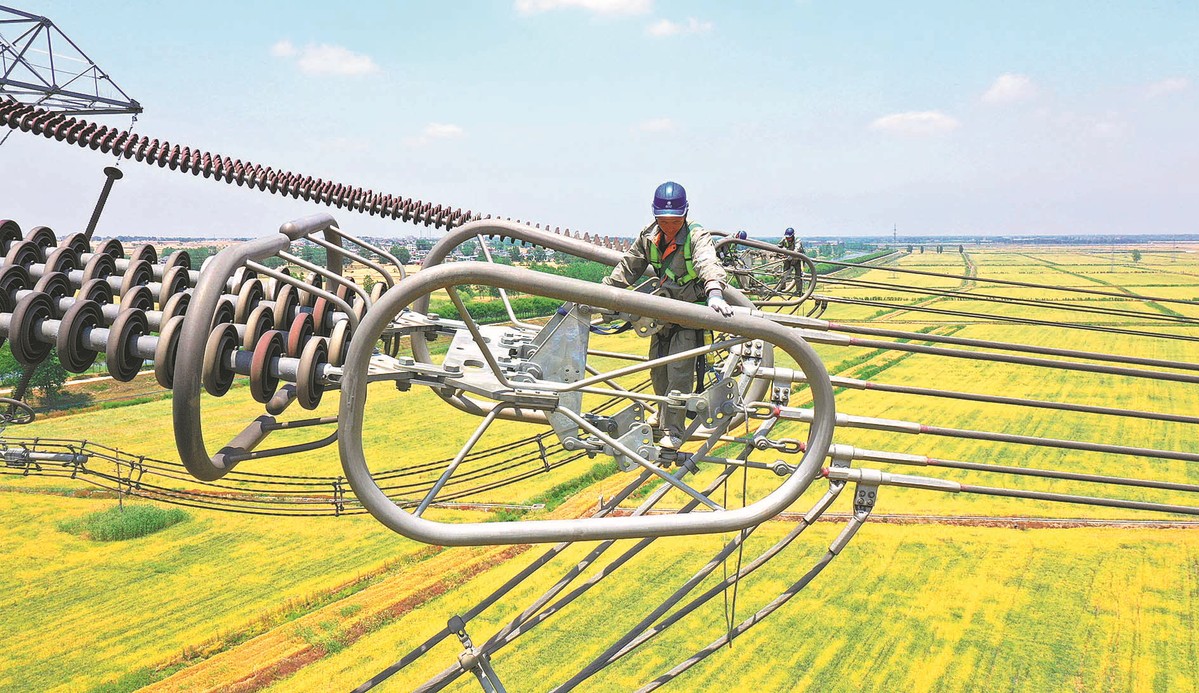 Engineers conduct an annual inspection of transmission lines at an altitude of 120 meters in Mingguang, Anhui province. SONG WEIXING/FOR CHINA DAILY