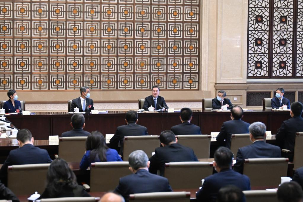 Ding Xuexiang, a member of the Standing Committee of the Political Bureau of the Communist Party of China (CPC) Central Committee and director of the General Office of the CPC Central Committee, participates in a group meeting of national political advisors from the environment and resource sector at the first session of the 14th National Committee of the Chinese People's Political Consultative Conference (CPPCC) in Beijing, capital of China, March 6, 2023. (Xinhua/Xie Huanchi)