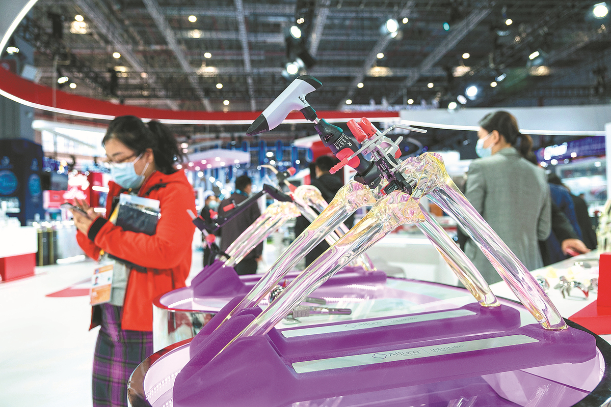 A total knee replacement system made by Johnson& Johnson, a multinational company based in the United States, is displayed at the fourth China International Import Expo in Shanghai in 2021. [Photo provided to China Daily]