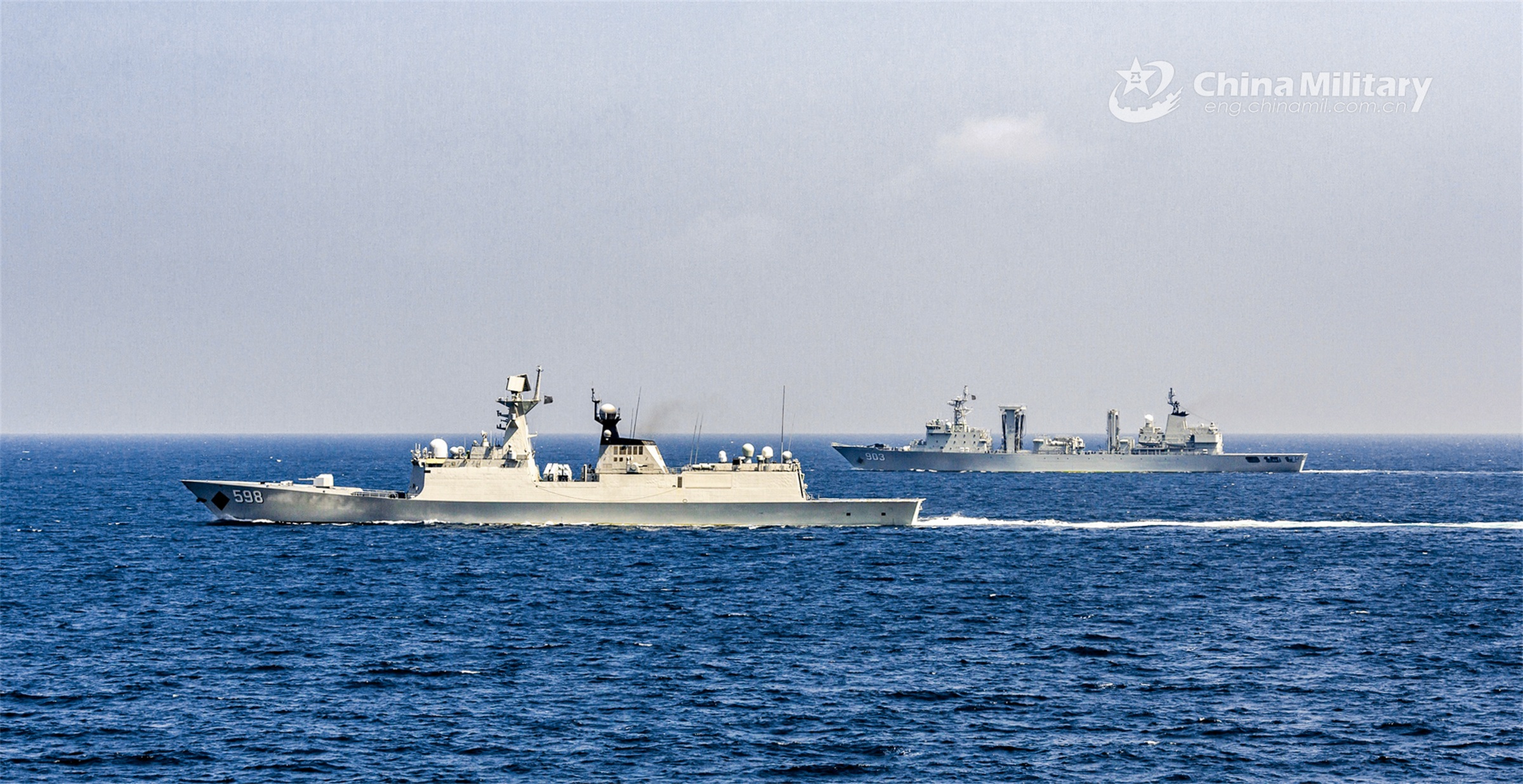 Comprehensive supply ship Kekexilihu (Hull 903) and guided-missile frigate Rizhao (Hull 598) attached to the 42nd Chinese naval escort taskforce sail in formation with full speed during a comprehensive training exercise on February 8, 2023. (eng.chinamil.com.cn/Photo by Ma Yubin)