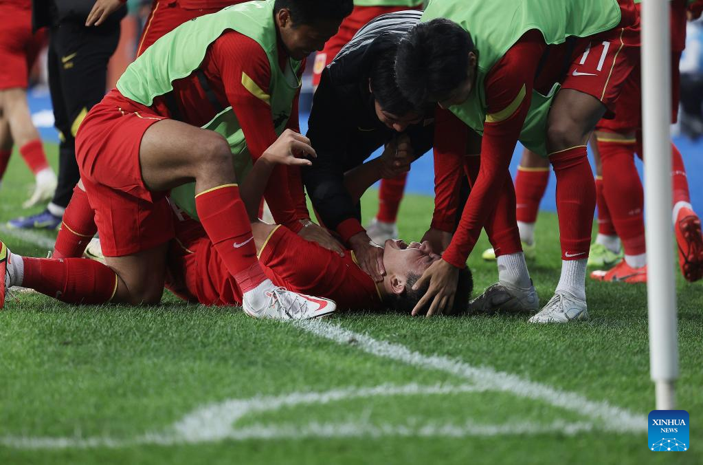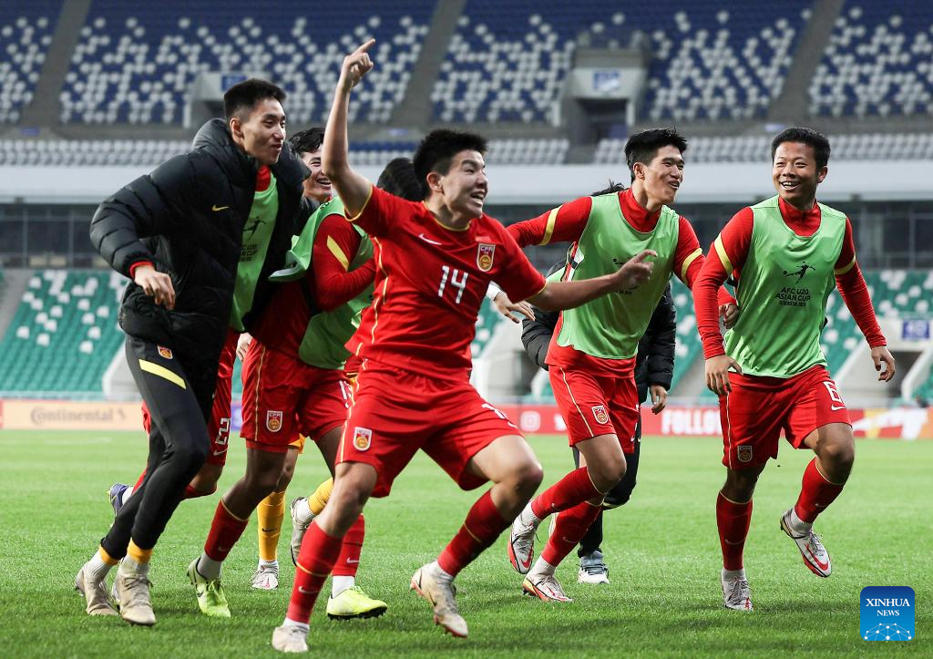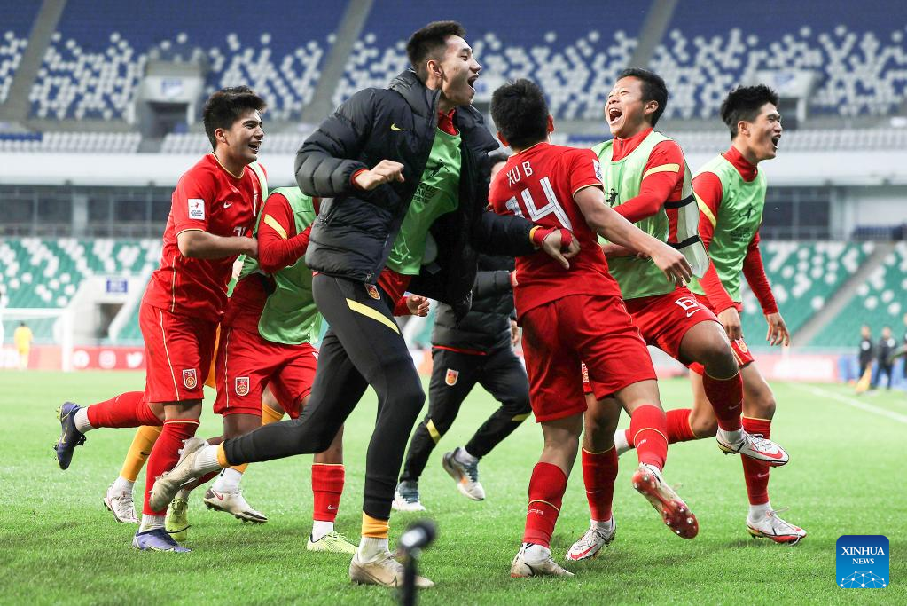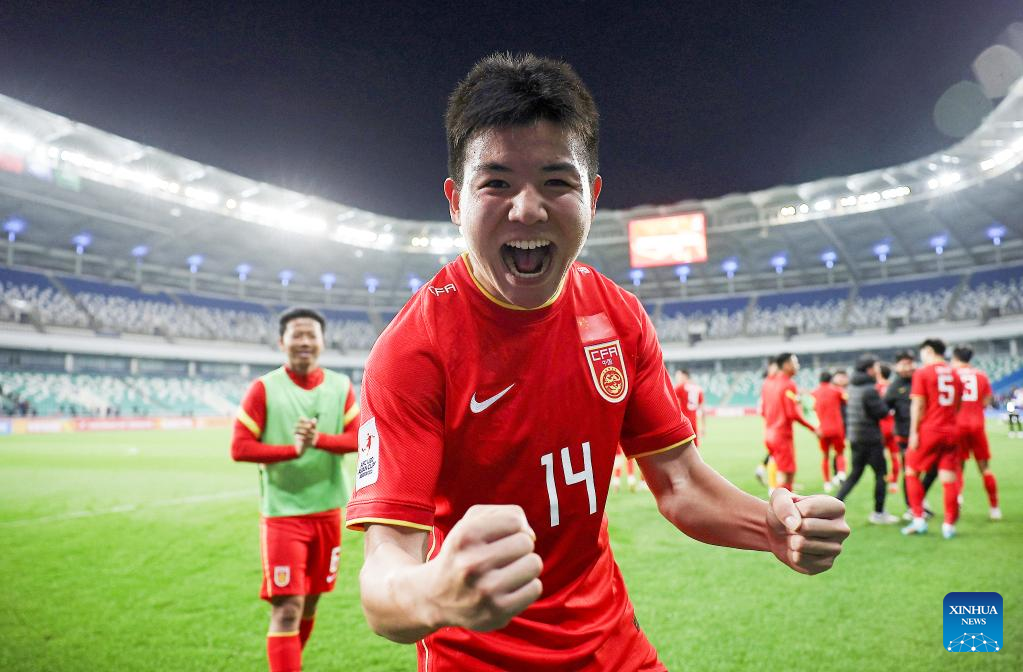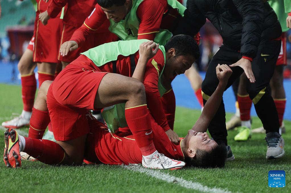 Xu Bin (front) of China celebrates after winning the Group D match between China and Saudi Arabia of AFC U20 Asian Cup in Tashkent, Uzbekistan, March 6, 2023. (Photo by Che Zhouyong/Xinhua)