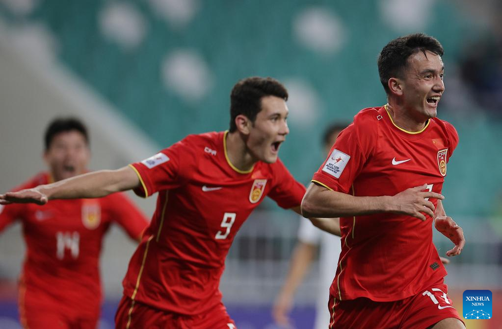 Mutalifu Yimingkari (1st R) of China celebrates scoring during the Group D match between China and Saudi Arabia of AFC U20 Asian Cup in Tashkent, Uzbekistan, March 6, 2023. (Photo by Che Zhouyong/Xinhua)