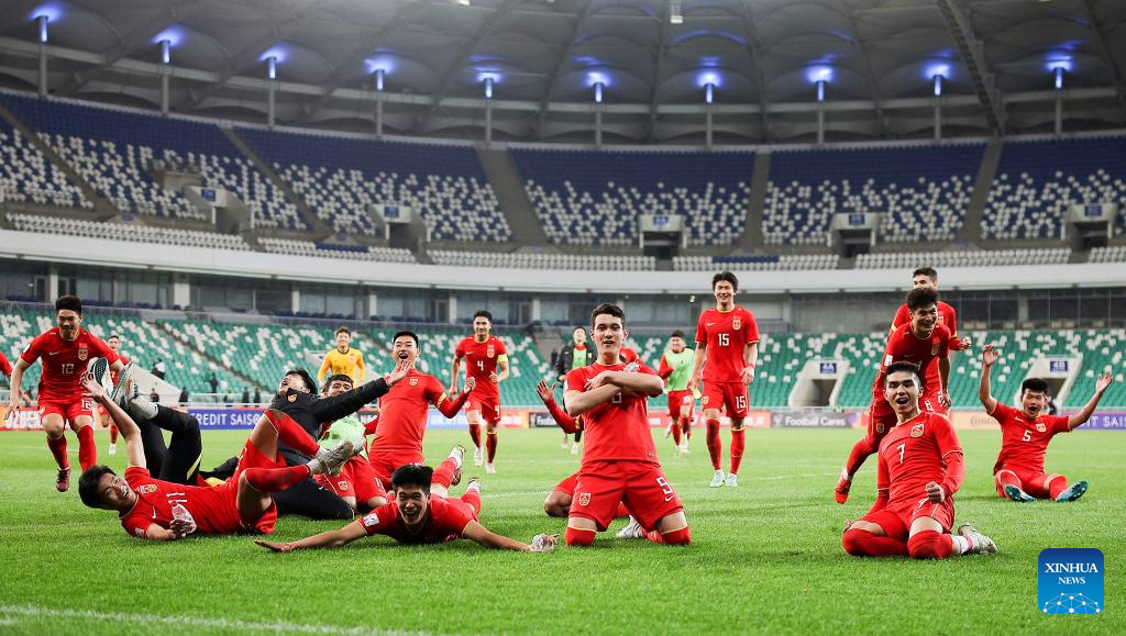 Players of China celebrate after winning the Group D match between China and Saudi Arabia of AFC U20 Asian Cup in Tashkent, Uzbekistan, March 6, 2023. (Photo by Che Zhouyong/Xinhua)