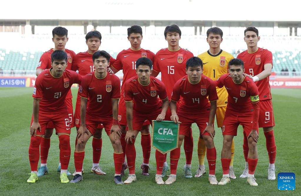 Starting players of China line up prior to the Group D match between China and Saudi Arabia of AFC U20 Asian Cup in Tashkent, Uzbekistan, March 6, 2023. (Photo by Che Zhouyong/Xinhua)