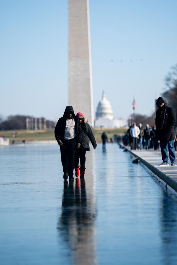 People walk on the frozen Lincoln Memorial Reflecting Pool in Washington, D.C., the United States, on Dec. 25, 2022. (Xinhua/Liu Jie)