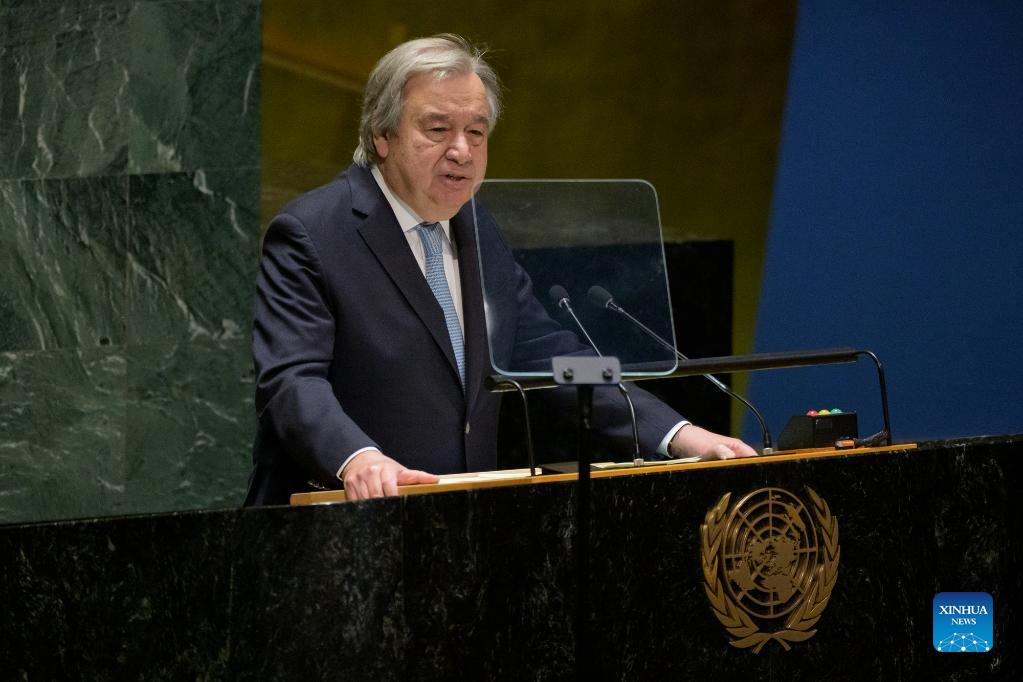 UN Secretary-General Antonio Guterres addresses the opening of the 67th session of the UN Commission on the Status of Women at the UN headquarters in New York, on March 6, 2023. Guterres on Monday called for actions to close gender gaps in science, technology and innovation, saying women's full contributions will benefit all. (Manuel Elas/UN Photo/Handout via Xinhua)