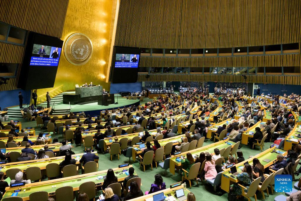 UN Secretary-General Antonio Guterres (at the podium and on screens) addresses the opening of the 67th session of the UN Commission on the Status of Women at the UN headquarters in New York, on March 6, 2023. Guterres on Monday called for actions to close gender gaps in science, technology and innovation, saying women's full contributions will benefit all. (Manuel Elas/UN Photo/Handout via Xinhua)