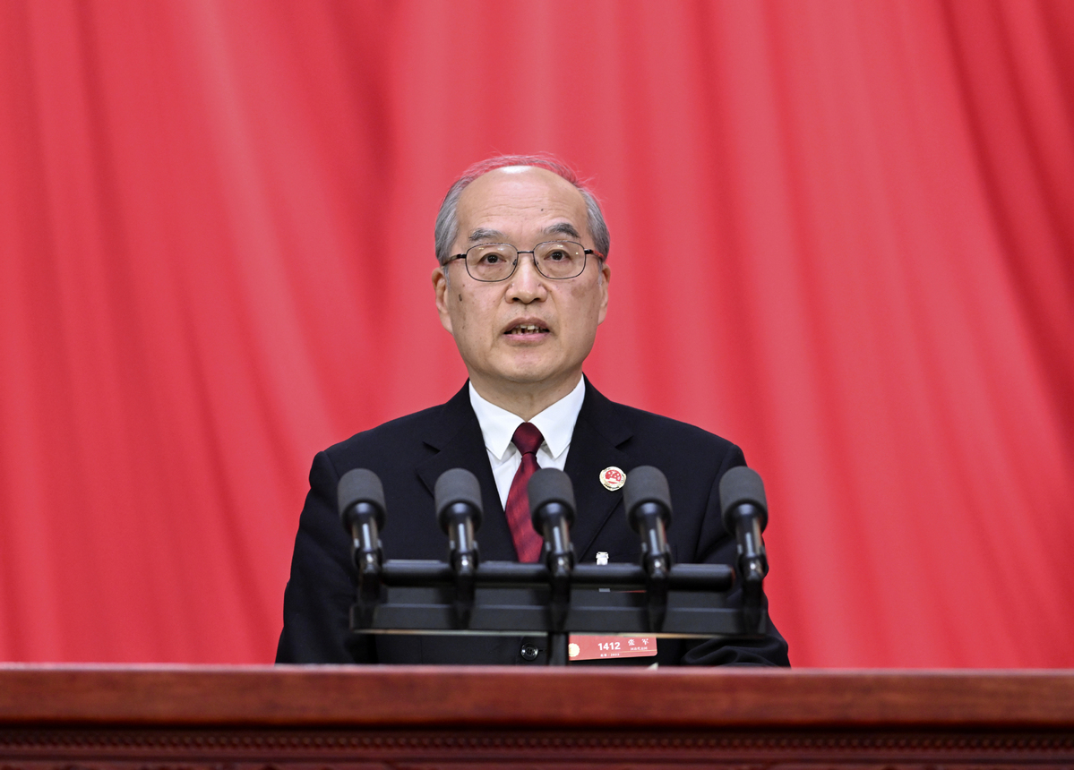 Zhang Jun, procurator-general of the Supreme People's Procuratorate (SPP), delivers a work report of the SPP at the second plenary meeting of the first session of the 14th National People's Congress (NPC) at the Great Hall of the People in Beijing, capital of China, March 7, 2023. [Photo/Xinhua]