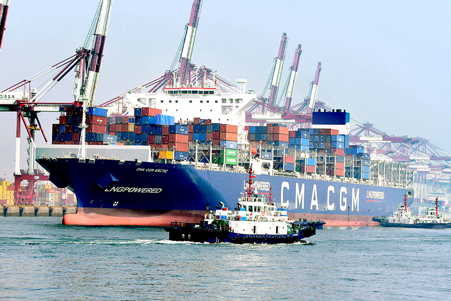 A containership docks at Qingdao Port, Shandong province. [PHOTO by YU FANGPING/FOR CHINA DAILY]