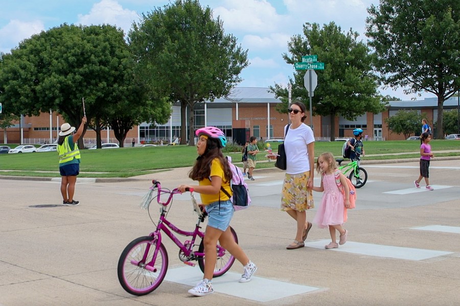 Elementary students walk home from school in Plano, Texas, the United States, on Aug. 31, 2022. (Photo by Xin Jin/Xinhua)
