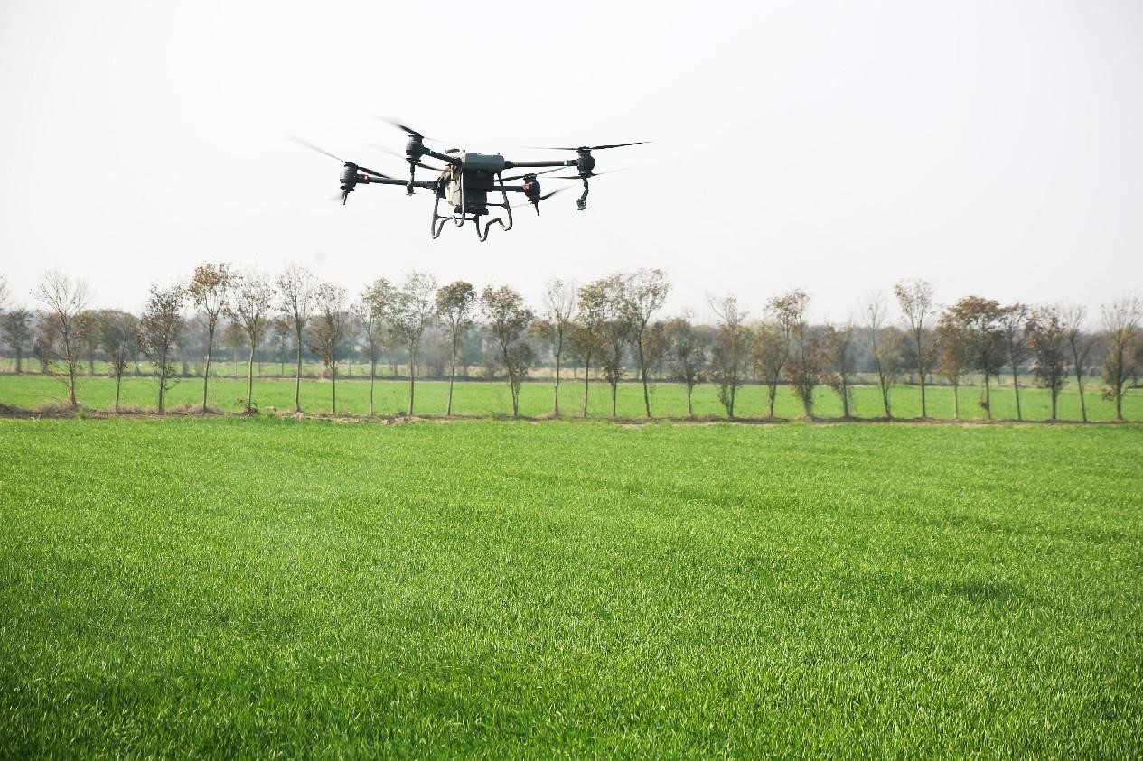 A drone sprays pesticide over a wheat field in a modern agricultural park in Xinbei district, Changzhou, east China's Jiangsu province, March 6, 2023. (People's Daily Online/Chen Wei)