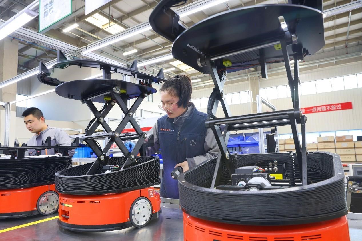 Smart robots go through quality inspection in a workshop of a company in Lujia township, Kunshan, east China's Jiangsu province, March 4, 2023. (People's Daily Online/Xu Congjun)