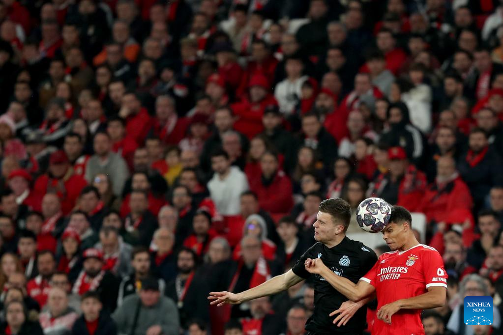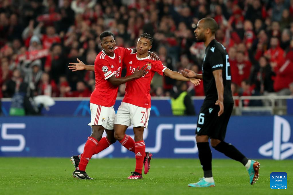 Players of Benfica celebrate scoring during the UEFA Champions League round of 16 second Leg football match between SL Benfica and Club Brugge at the Luz stadium in Lisbon, Portugal on March 7, 2023. (Photo by Pedro Fiuza/Xinhua)