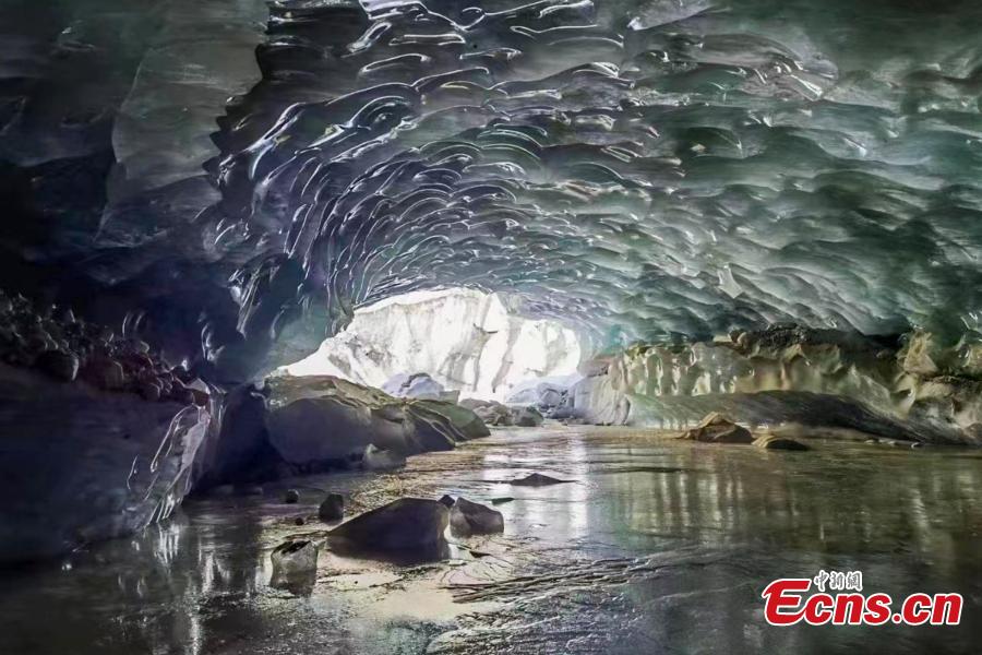 A large ice cave is discovered near a "three-colored lakes" in Puyu Village of Banbar County, Qamdo, southwest China's Tibet Autonomous Region, March 7, 2023. (Photo/China News Service)