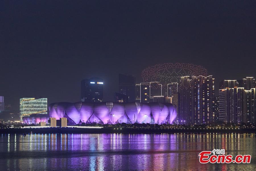 A light show featuring Hangzhou's iconic attractions is staged with 500 drones to mark the 200-day countdown of Hangzhou 2022 Asian Games at Hangzhou Olymic Sports Center Stadium, nicknamed "the Big Lotus", east China's Zhejiang Province, March 7, 2023. (Photo: China News Service/Wang Gang)