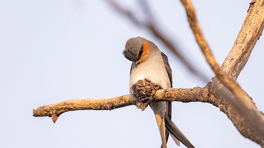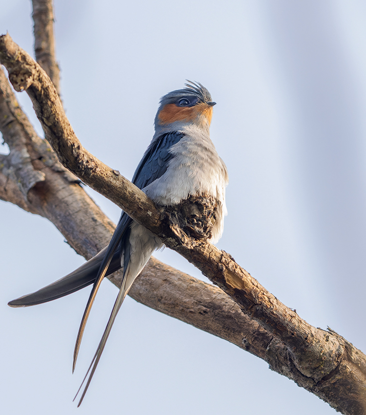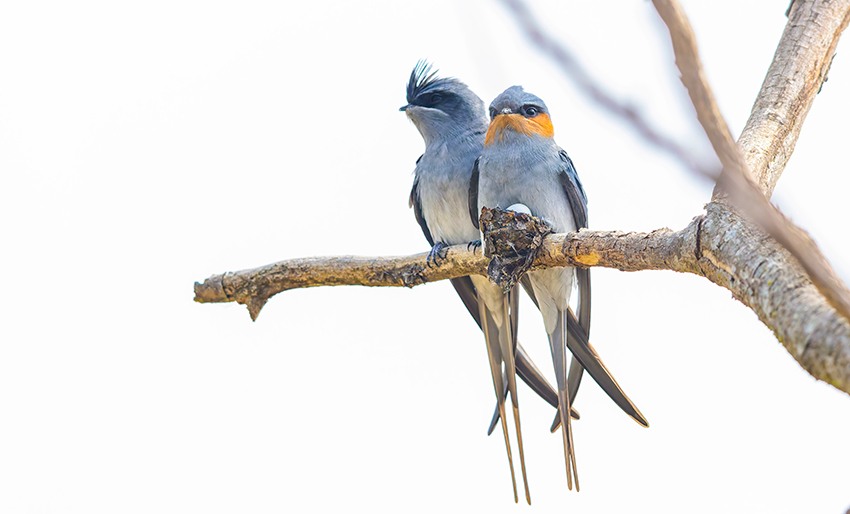 The crested treeswift, which is under second-class protection in China, is a small, slender bird with a long crest on its forehead. It builds a tiny, cup-shaped nest on a tree branch, which can only cradle a single egg. Both the male and the female take turns to incubate the egg.