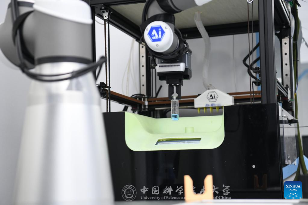 The AI-Chemist system performs a chemical experiment at a laboratory in the University of Science and Technology of China in Hefei, Anhui province, Oct. 21, 2022. [Photo/Xinhua]
