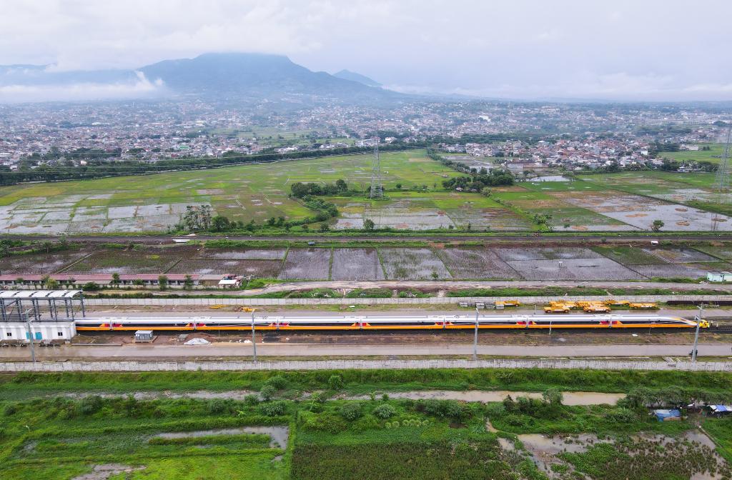 This aerial photo taken on Nov. 8, 2022 shows a comprehensive inspection train running on the Jakarta-Bandung High-Speed Railway trial section to conduct inspection in Bandung, Indonesia. (Xinhua/Xu Qin)