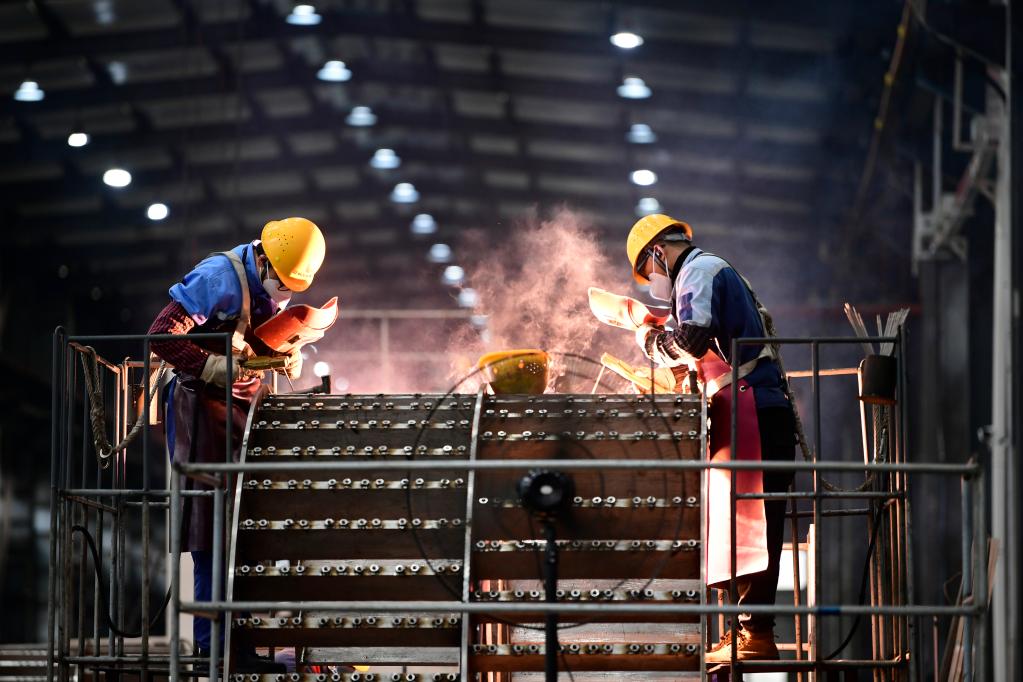 Staff members operate at a workshop in a technology equipment company in Ganzhou, east China's Jiangxi Province, Feb. 13, 2023. (Photo by Hu Jiangtao/Xinhua)