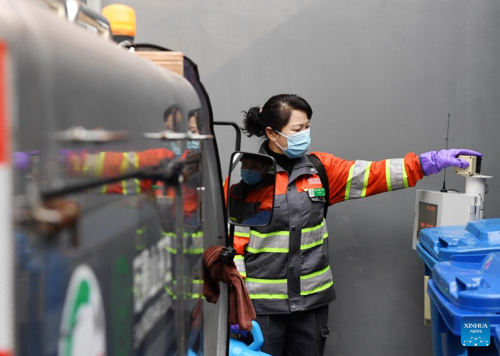Liu Mingqun disinfects a garbage truck at a garbage station in Shijingshan District of Beijing, capital of China, Feb. 17, 2023. (Xinhua/Zhang Chenlin)
