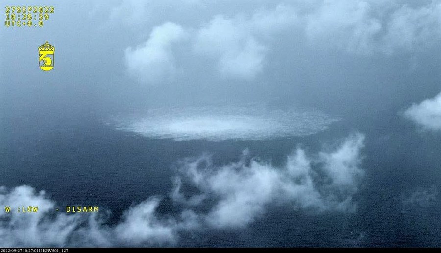 Aerial photo provided by the Swedish Coast Guard on Sept. 27, 2022 shows the gas leak from Nord Stream in the Baltic Sea. (The Swedish Coast Guard/Handout via Xinhua)