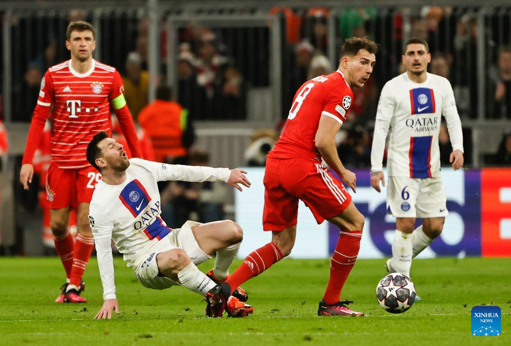 Lionel Messi (2nd L) of Paris Saint-Germain falls down during the UEFA Champions League round of 16 second leg football match between Bayern Munich and Paris Saint-Germain in Munich, Germany, on March 8, 2023. (Photo by Philippe Ruiz/Xinhua)