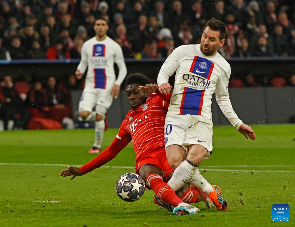 Lionel Messi (R) of Paris Saint-Germain vies with Alphonso Davies of Bayern Munich during the UEFA Champions League round of 16 second leg football match between Bayern Munich and Paris Saint-Germain in Munich, Germany, on March 8, 2023. (Photo by Philippe Ruiz/Xinhua)