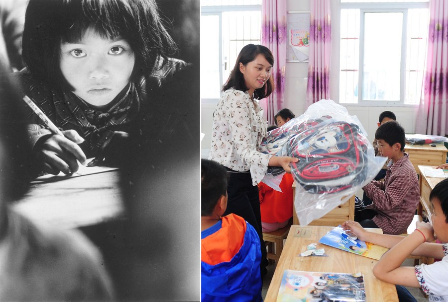 Combo photo shows Su Mingjuan at class in this promotional photo of Hope Project (L, file photo by Xie Hailong) and Su giving gifts to students in Jinzhai Sanhe experimental school, her alma mater in Jinzhai, east China's Anhui Province, May 29, 2019 (R, photo by Wong Congqi). (Xinhua)