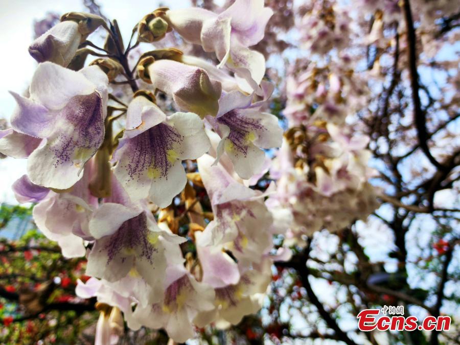 Princess trees along Jinjiang River are in full blossoms with purple flowers in Chengdu, east China's Sichuan Province, March 10, 2023. (Photo: China News Service/Lv Yang)