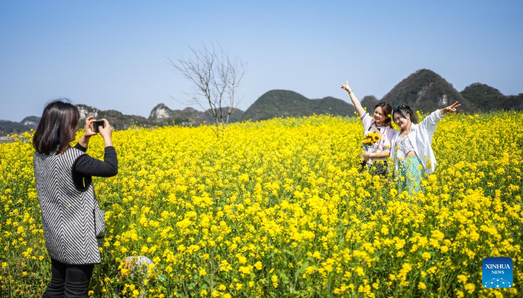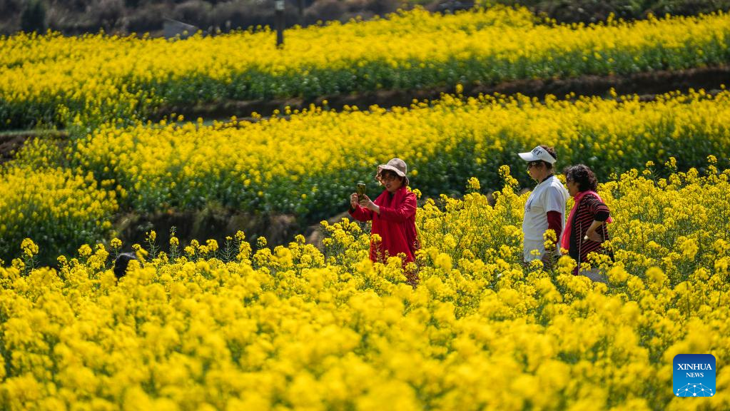 Tourists take photos in a cole flower field in Wayao Village of Mugang Town, Liuzhi Special District, Liupanshui, southwest China's Guizhou Province, March 9, 2023. (Xinhua/Tao Liang)