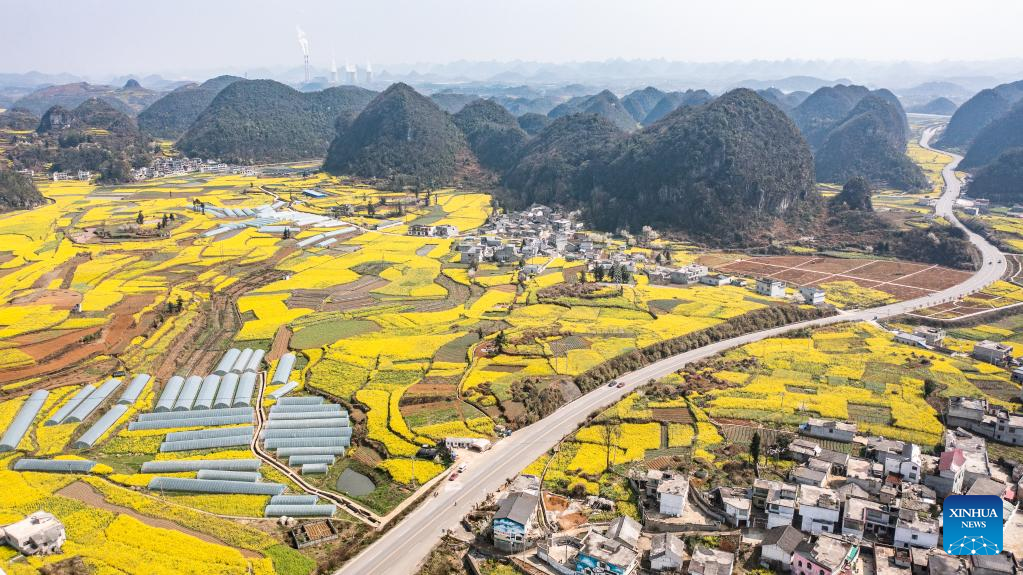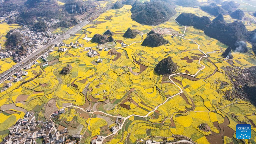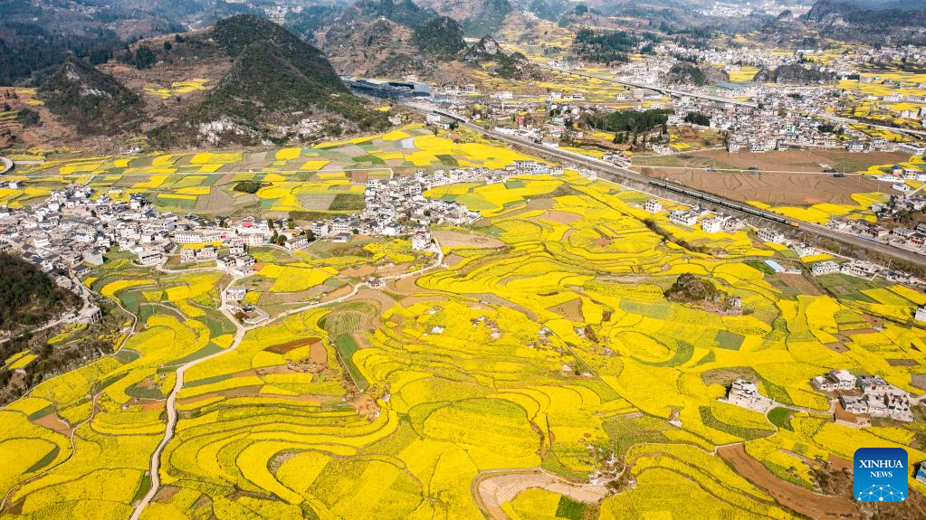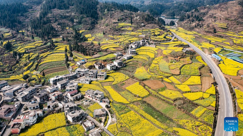 This aerial photo taken on March 9, 2023 shows cole flower fields in Dibo Village of Mugang Town, Liuzhi Special District, Liupanshui, southwest China's Guizhou Province. (Xinhua/Tao Liang)