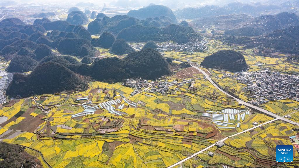 This aerial photo taken on March 9, 2023 shows cole flower fields in Wayao Village of Mugang Town, Liuzhi Special District, Liupanshui, southwest China's Guizhou Province. (Xinhua/Tao Liang)