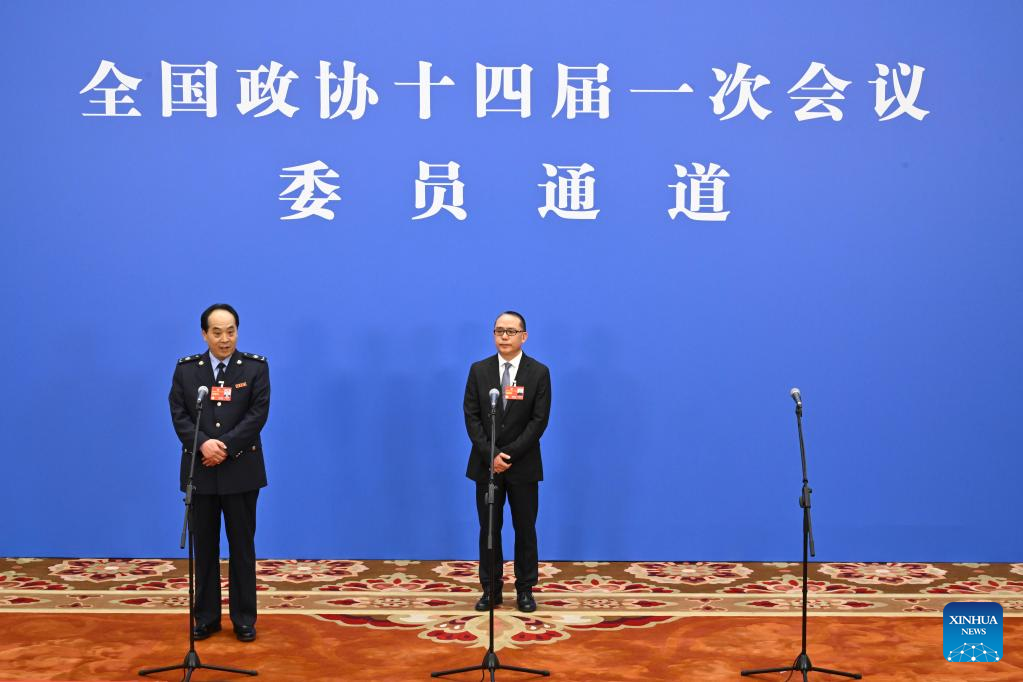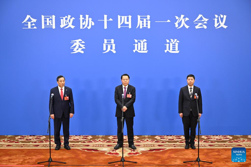 Members of the 14th National Committee of the Chinese People's Political Consultative Conference (CPPCC) are interviewed ahead of the closing meeting of the first session of the 14th CPPCC National Committee at the Great Hall of the People in Beijing, capital of China, March 11, 2023. (Xinhua/Zhang Cheng)