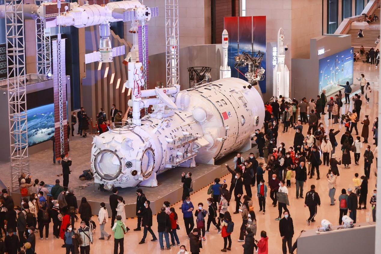 A model combination of the Tianhe core module and China's space station is exhibited at the National Museum of China, Feb. 28, 2023. (Photo by Chen Xiaogen/People's Daily Online)