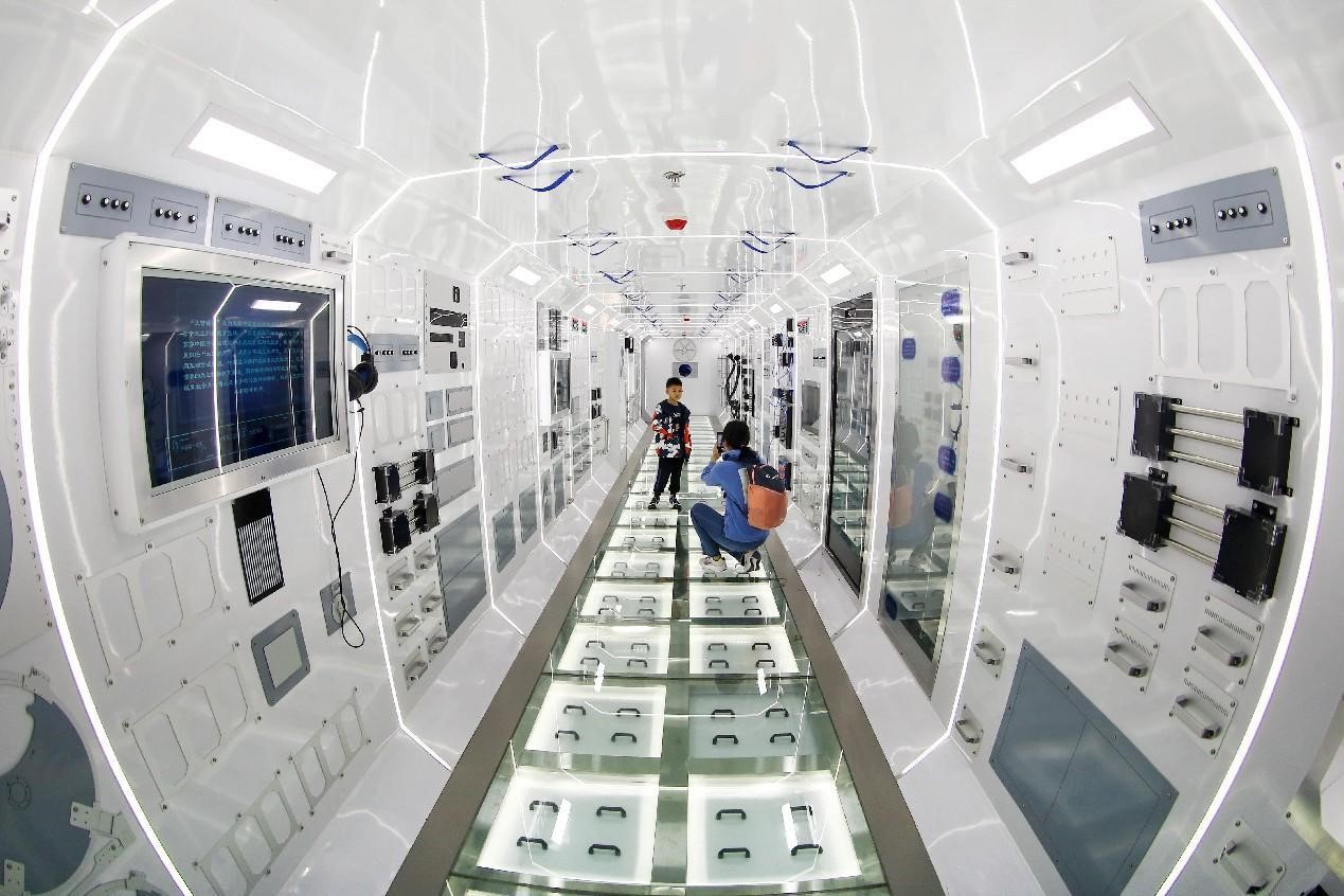 A child poses for a picture in a model space station at the Shandong Science & Technology Museum, March 5, 2023. (Photo by Hao Xincheng/People's Daily Online)