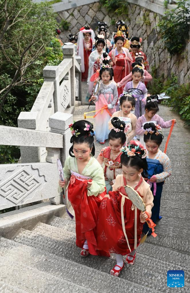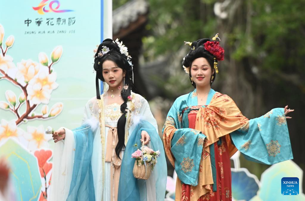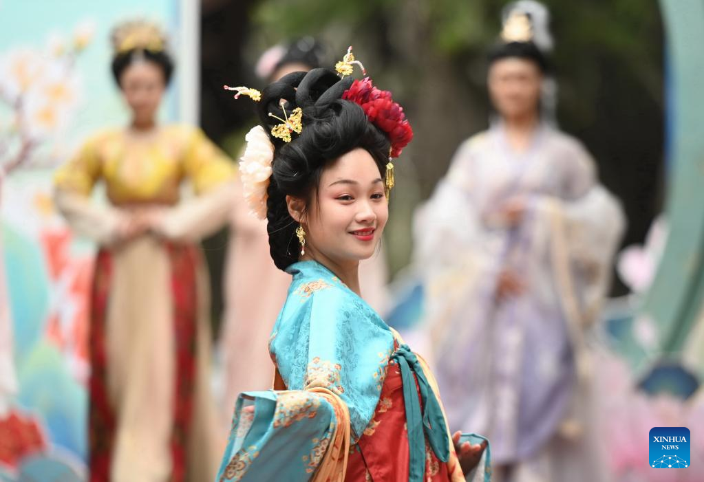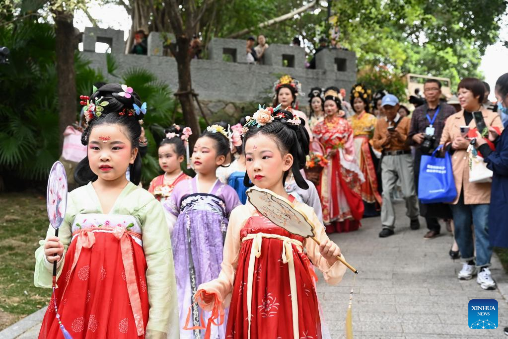 Performers display festival attire to celebrate Hua Zhao Jie, meaning Flower Festival, at a park in Fuzhou, southeast China's Fujian Province, March 11, 2023. (Xinhua/Lin Shanchuan)