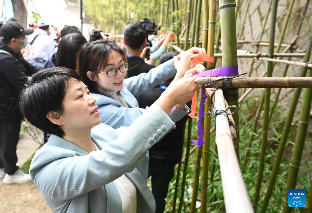People tie colored ribbons to celebrate Hua Zhao Jie, meaning Flower Festival, at a park in Fuzhou, southeast China's Fujian Province, March 11, 2023. (Xinhua/Lin Shanchuan)