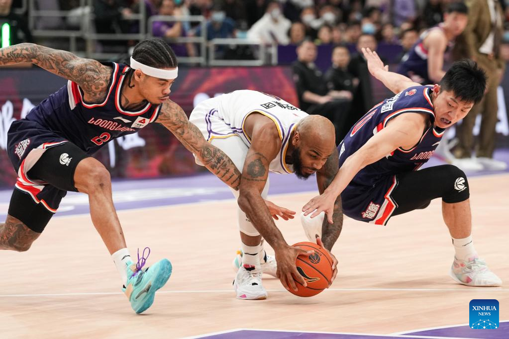 Nathaniel Mason (L) and Tian Yuheng (R) of Guangzhou Loong Lions vie with Robert Golden of Beijing Royal Fighters during the 33rd round match between Beijing Royal Fighters and Guangzhou Loong Lions of 2022-2023 season of the Chinese Basketball Association (CBA) league in Beijing, capital of China, on March 11, 2023. (Xinhua/Ju Huanzong)