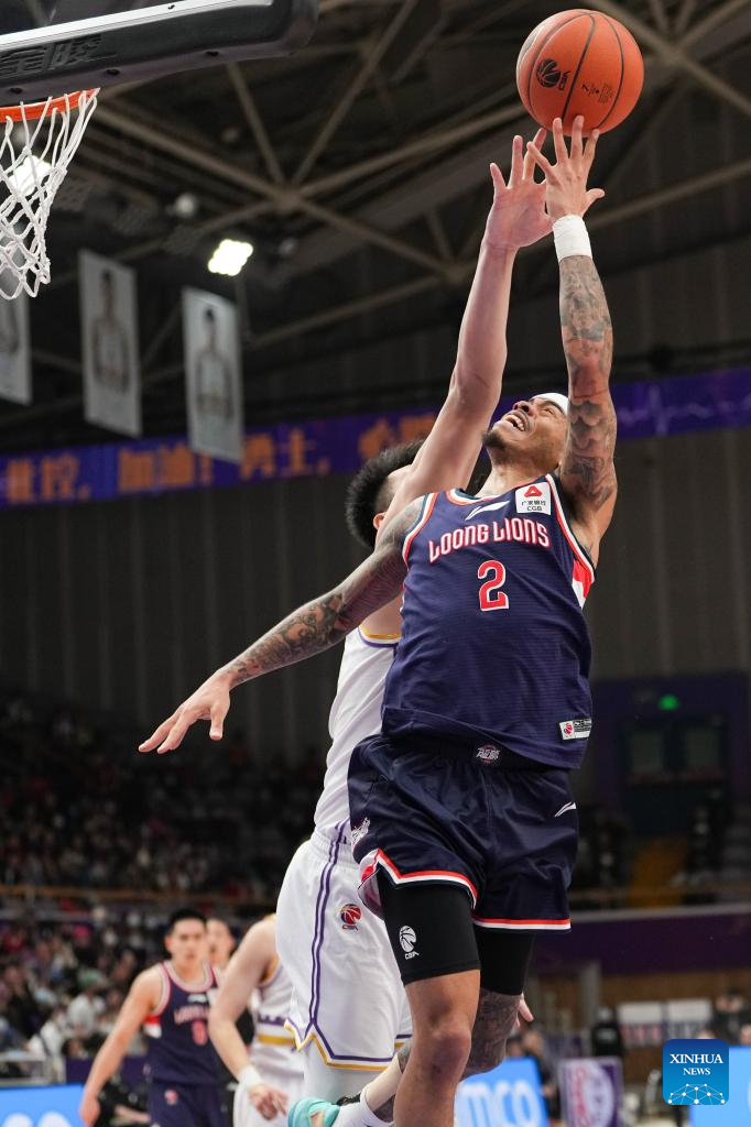 Nathaniel Mason (R) of Guangzhou Loong Lions goes for a lay-up during the 33rd round match between Beijing Royal Fighters and Guangzhou Loong Lions of 2022-2023 season of the Chinese Basketball Association (CBA) league in Beijing, capital of China, on March 11, 2023. (Xinhua/Ju Huanzong)