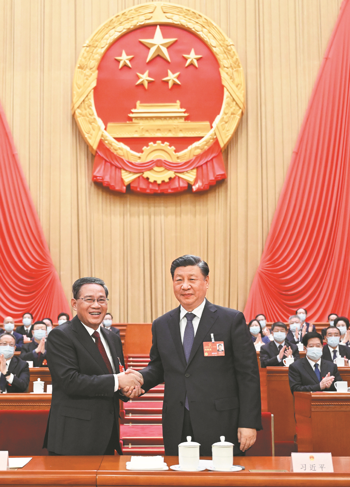 President Xi Jinping (right), who is also general secretary of the CPC Central Committee and chairman of the Central Military Commission, shakes hands with Li Qiang, after Li was endorsed as premier at a plenary meeting of the first session of the 14th National People's Congress in Beijing on Saturday. [LI XUEREN/XINHUA]