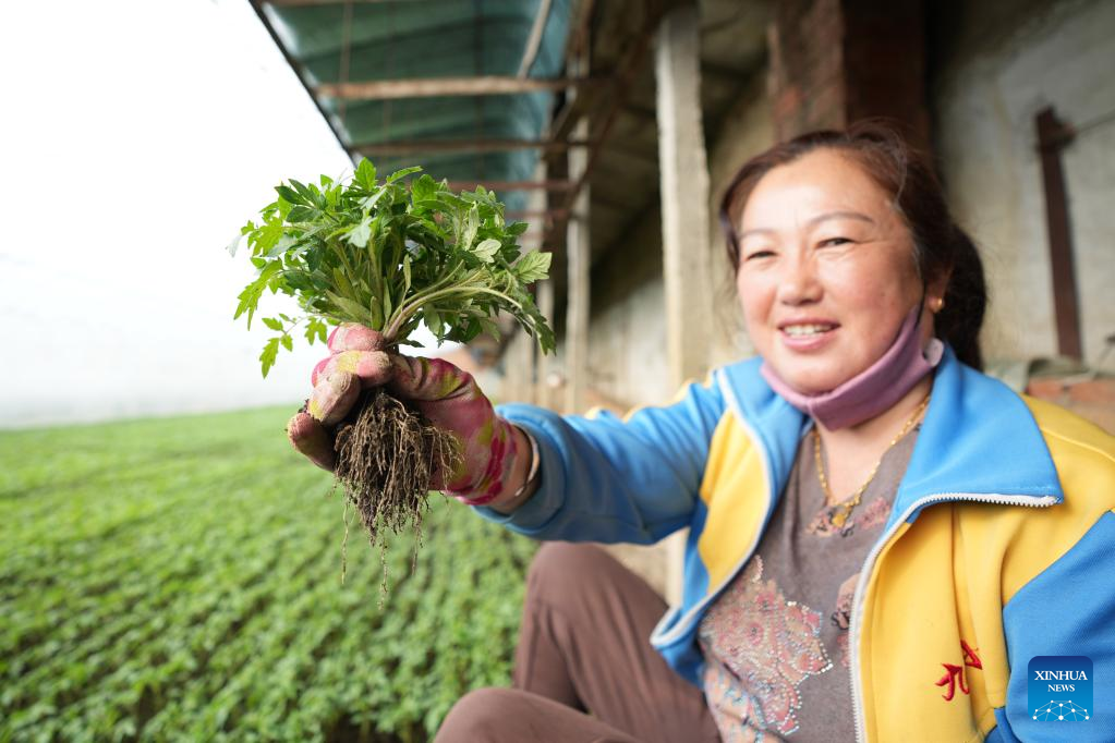A villager holds tomato seedlings in her hand at a greenhouse in Wanxing Village of Changqing Township, Jiamusi, northeast China's Heilongjiang Province, March 9, 2023. In Heilongjiang Province, though the temperature is still low in early spring, villagers are taking advantage of greenhouses to boost agricultural production efficiency and increase their income. (Xinhua/Wang Jianwei)