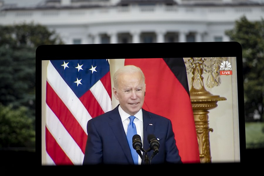 Photo taken in Arlington of Virginia, the United States, shows a screen displaying U.S. President Joe Biden and German Chancellor Olaf Scholz (not pictured) attending a press conference at the White House in Washington, D.C. Feb. 7, 2022. Joe Biden told the press conference that if Russian tanks and troops cross the border and enter Ukraine, "there will be no longer Nord Stream 2," referring to the now-finished pipeline delivering natural gas from Russia to Germany through Ukraine. (Xinhua/Liu Jie)