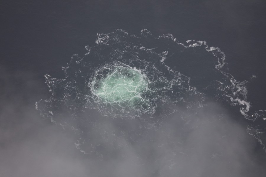 Aerial photo provided by the Swedish Coast Guard on Sept. 28, 2022 shows the fourth leak on Nord Stream 2 pipeline in Sweden's exclusive economic zone. (The Swedish Coast Guard/Handout via Xinhua)