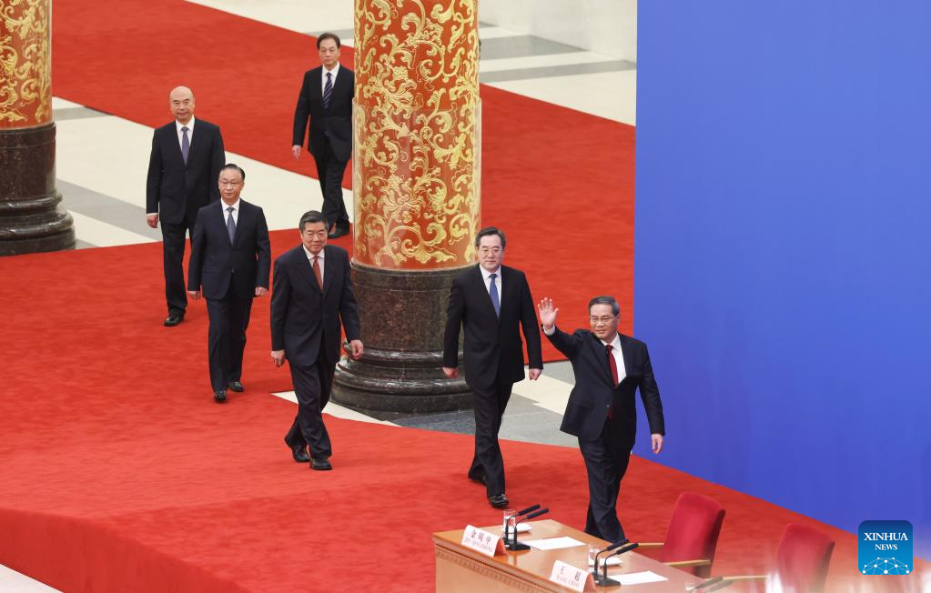 Chinese Premier Li Qiang (1st R) arrives for a press conference after the closing of the first session of the 14th National People's Congress (NPC) at the Great Hall of the People in Beijing, capital of China, March 13, 2023. Vice premiers Ding Xuexiang, He Lifeng, Zhang Guoqing and Liu Guozhong attended the press conference. (Xinhua/Liu Bin)