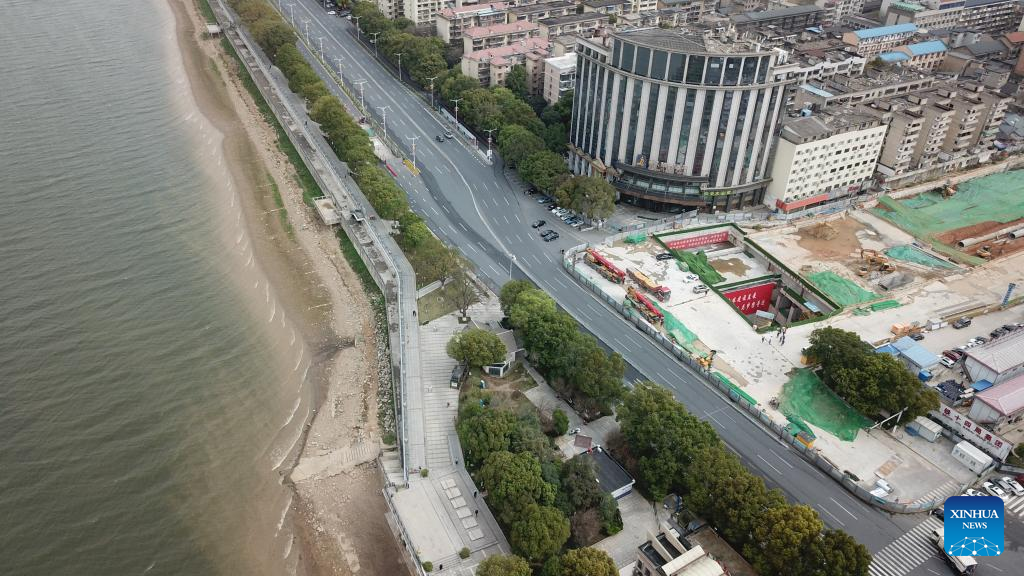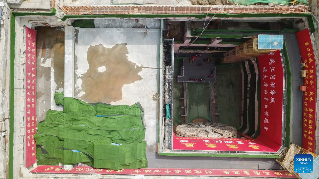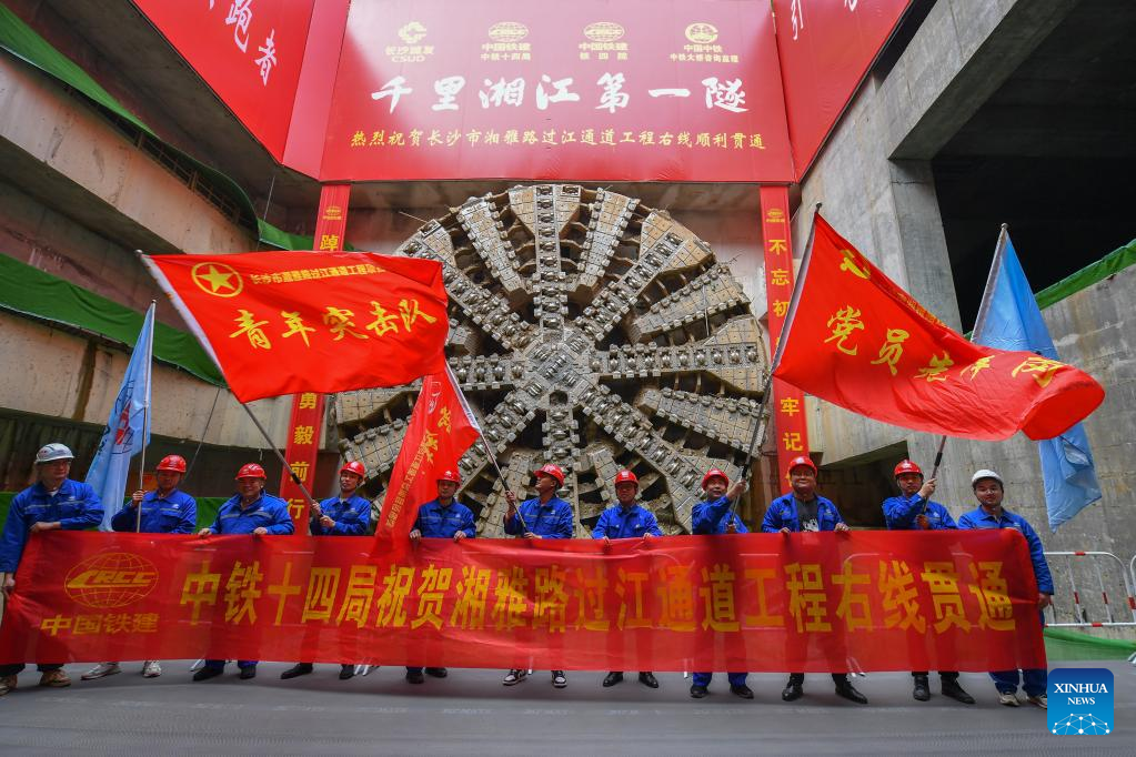 This aerial photo taken on March 12, 2023 shows the right-line tunnel of the Xiangya Road river-crossing passway is drilled through in Changsha, central China's Hunan Province. The drill-through of the right-line tunnel, together with the left-line tunnel drilled through a year ago, means the construction of the main part of the two-way river-crossing passway is near completion. (Xinhua/Chen Zeguo)