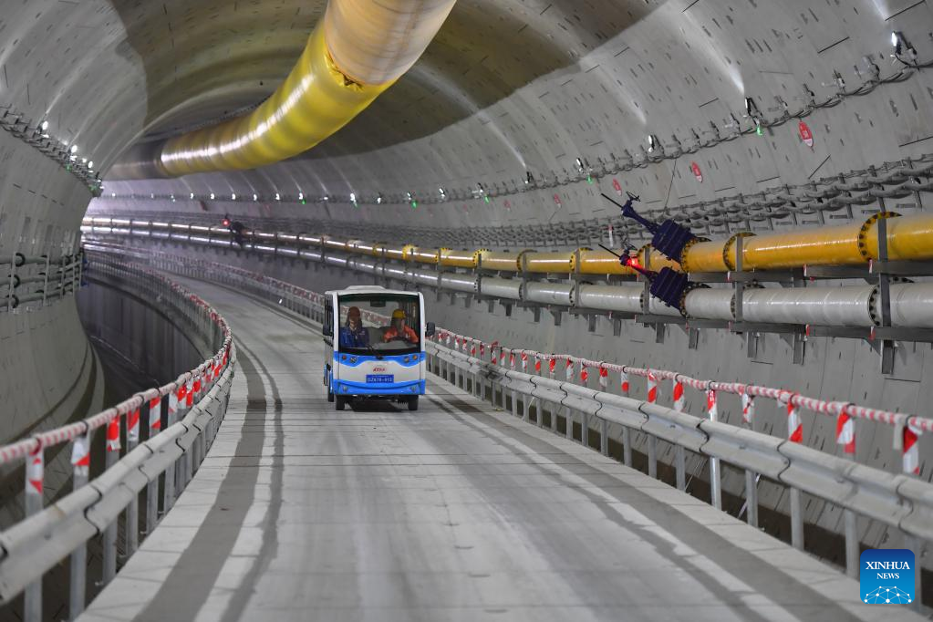 Workers of China Railway 14th Bureau Group Corporation Limited patrol in the right-line tunnel of the Xiangya Road river-crossing passway in Changsha, central China's Hunan Province, March 12, 2023. The drill-through of the right-line tunnel, together with the left-line tunnel drilled through a year ago, means the construction of the main part of the two-way river-crossing passway is near completion. (Xinhua/Chen Zeguo)